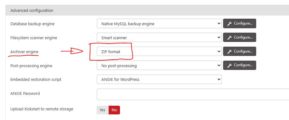 - Após a configuração do assistente, dentro do plugin, acesse a opção “configuration”. Navegue até a sessão “Advanced configuration” e selecione a opção “Zip Format”. Como mostra a imagem abaixo: